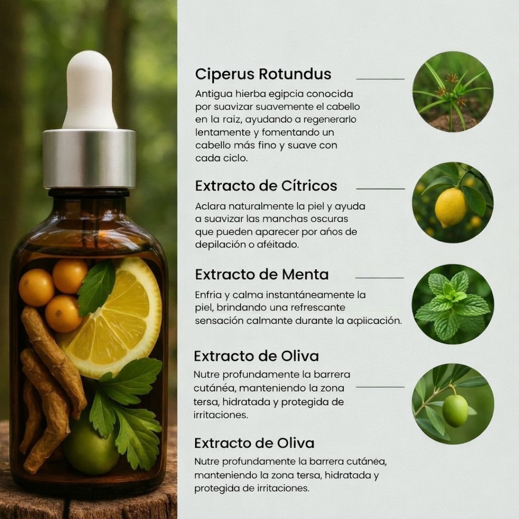- Ayuda a disminuir el vello existente con tu método preferido. Este aceite funciona mejor en piel limpia y sin vello.