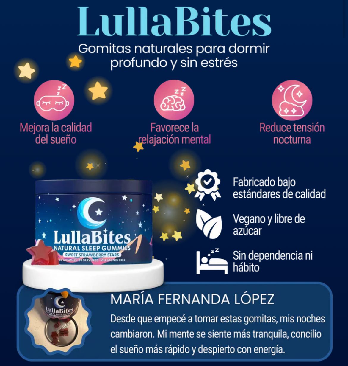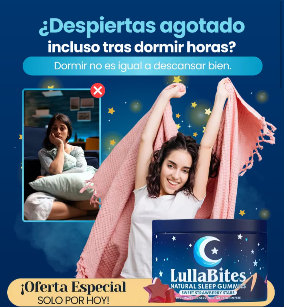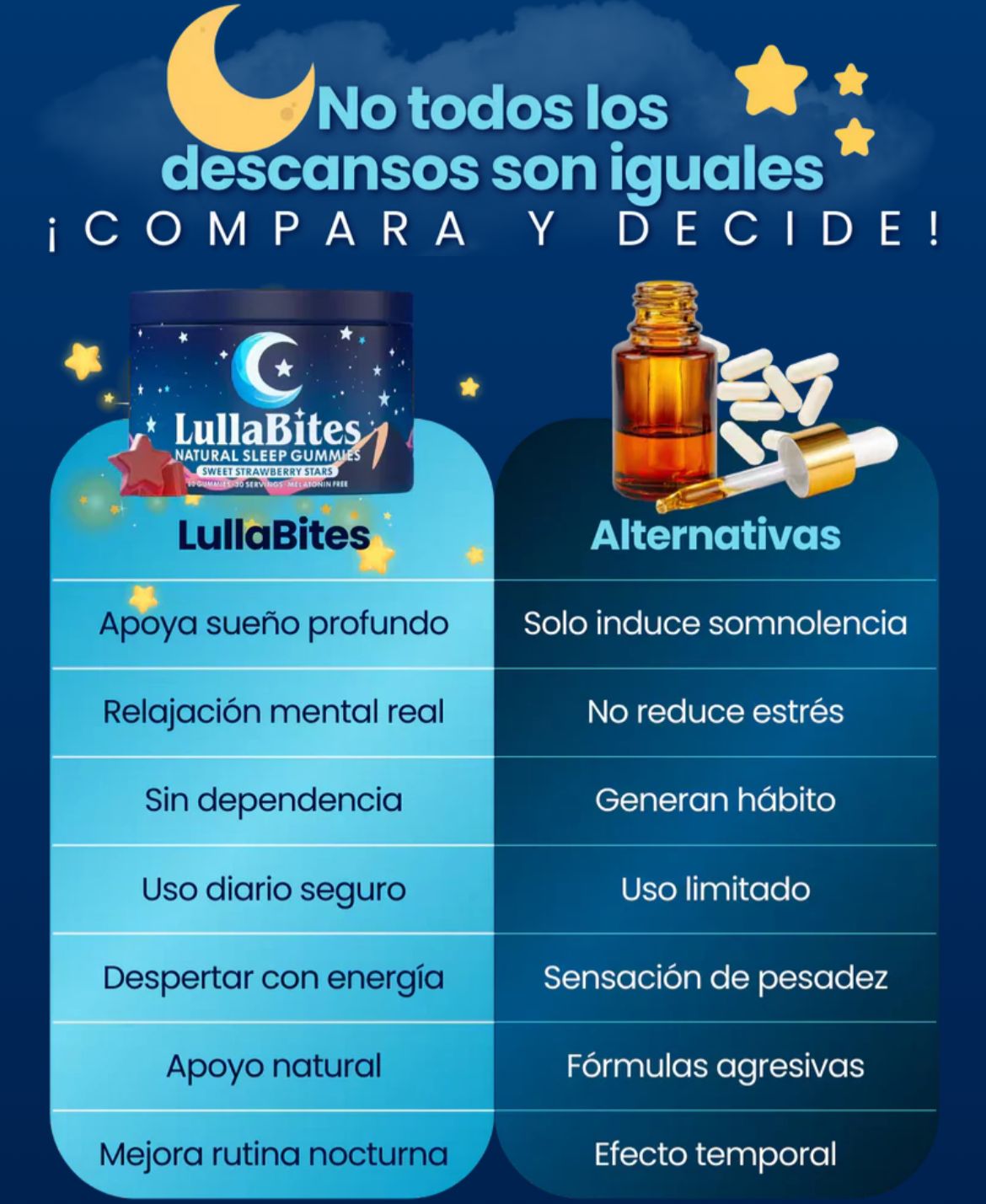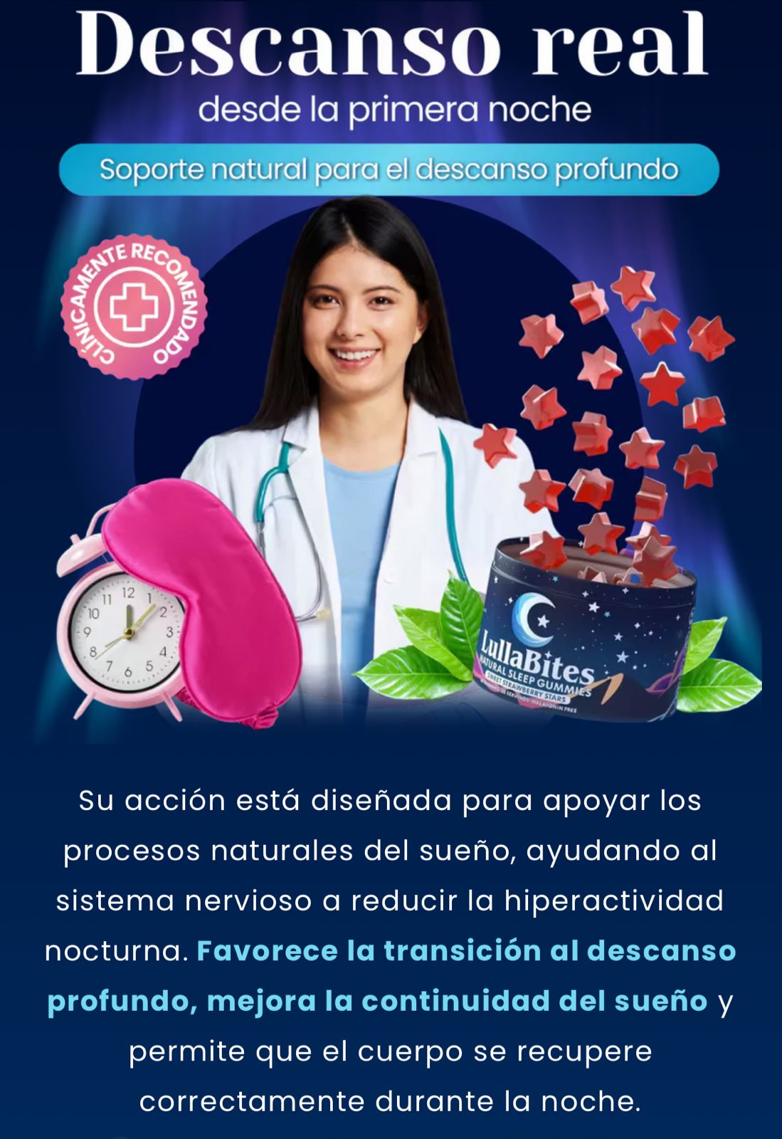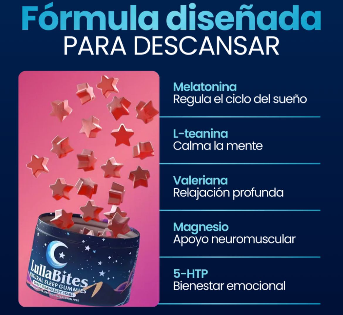 Incluye melatonina, L-teanina, valeriana, 5-HTP.