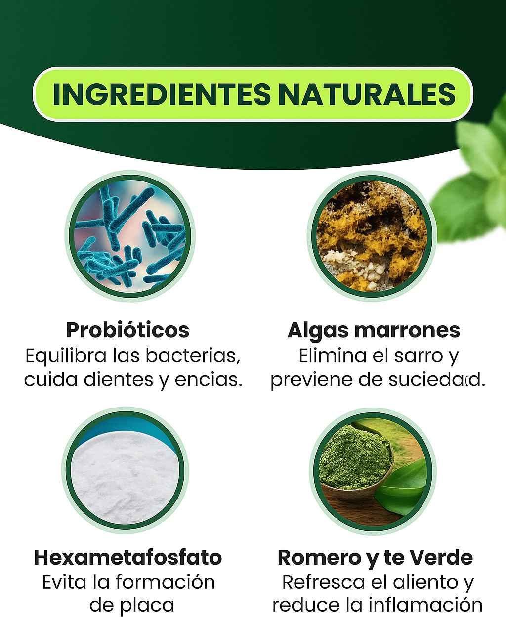 Los probióticos y la menta eliminan las bacterias que causan mal olor, dejando un aliento fresco en pocos días.
